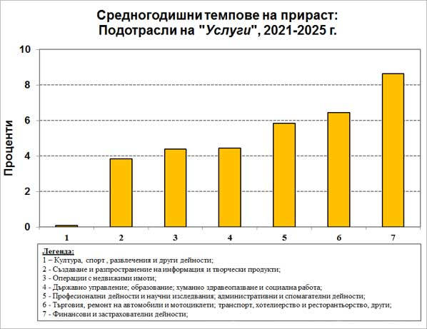 на прираст за последното петилетие. Така например, отрасъл „Селско, горско и рибно стопанство“ бележи прираст от 30,1% през 2021 г., но спад от 15,3% през 2023 г.; отрасъл „Добивна промишленост; преработваща промишленост; производство и разпределение на електрическа и топлинна енергия и на газообразни горива; доставяне на води; канализационни услуги, управление на отпадъци и възстановяване“ отчита прираст от 14,3% през 2022 г. и спад от 7,2% през 2024 г.; отрасъл „Строителство“ отчита спад от 10,8% през 2021 г., но прираст от 11% през 2024 г.; отрасъл „Финансови и застрахователни дейности“ отчита прираст от 24,9% през 2021 г. и спад от 0,5% през 2023 г. и др. Това е причината, поради която в настоящата бележка се оперира със средногодишни темпове на прираст за 2021-2025 г., осреднени по непретеглен средноаритметичен метод.