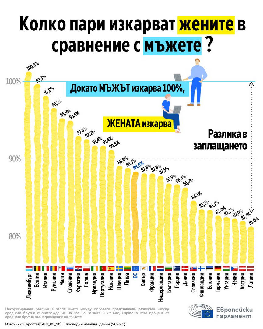 - Естония: 21,3%. Това е страната в ЕС с най-голямата разлика в заплащането между половете. Отчасти поради традиционните роли и силно сегрегирания пазар на труда. Жените често работят в по-нископлатени сектори като образованието и здравеопазването.